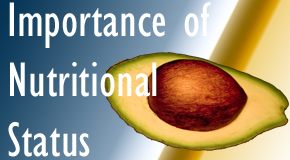 Your health status and nutritional status mirror each other. Nutritional status is measured by a mix of factors: serum levels, weight, and other issues. “ABCD” are factors considered – Anthropomorphic status (weight/body), Biochemical (blood tests), Clinical (how well the body functions work as checked by a physician) and Dietary (what you eat). Moriarty Chiropractic can discover much about the nutritional status of a Nashua chiropractic patient during the first clinical Nashua chiropractic examination and set up a treatment plan to deal with any nutritional concerns that pop up especially in patients who may be susceptible to a back surgery or any other surgical intervention for that matter. A good pre-surgical nutritional status will facilitate Nashua post-surgical healing and reduce Nashua post-back surgical problems.Good status also helps healing with non-surgical care!